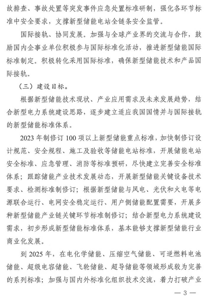 到2025年,在电化学储能、压缩空气储能、可逆燃料电池储能、超级电容储能、飞轮储能、超导储能等领域形成较为完善的系列标准;加强与国内外标准化组织技术交流,着力打破产业发展瓶颈,规范引导产业高质量发展,保障储能电站安全;加大国际标准化力度, 深度参与国际电工委员会(IEC) 国际标准化工作,支撑标准走出去。逐步构建适应技术创新趋势、满足产业发展需求、对标国际先进水平的新型储能标准体系。
